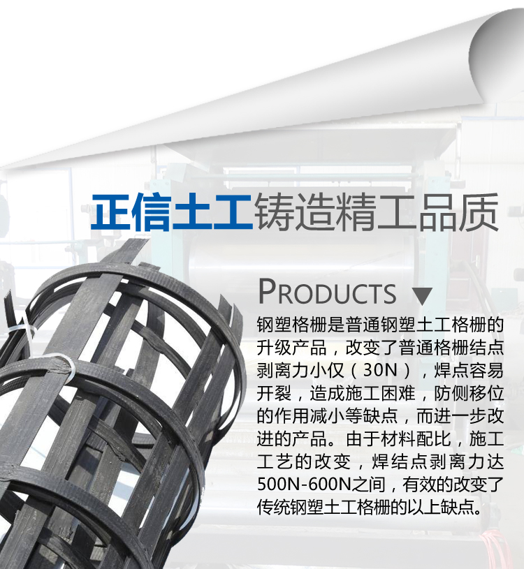 1、鋼塑格柵的拉力由經(jīng)緯編織的高強(qiáng)鋼絲承擔(dān),在低應(yīng)變能力下產(chǎn)生極高的抗拉模量,縱橫向肋條協(xié)同作用,充分發(fā)揮格柵對(duì)土體的嵌鎖作用。