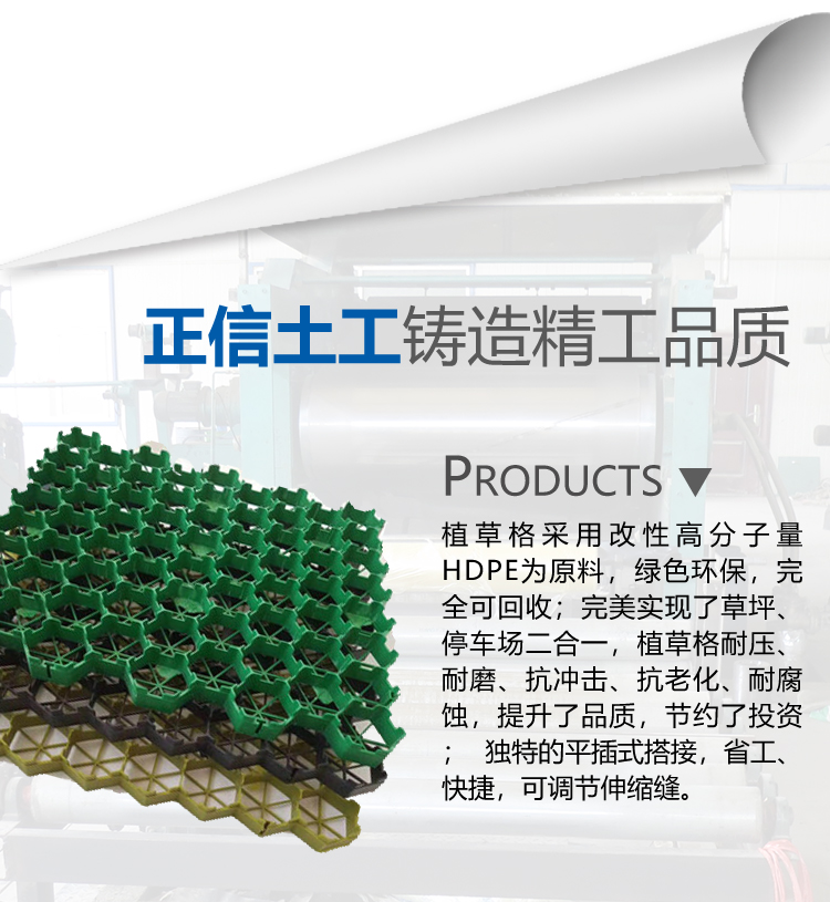 植草格采用改性高分子量HDPE為原料,綠色環(huán)保,可回收;實(shí)現(xiàn)了草坪、停車場二合一,植草格耐壓、耐磨、抗沖擊、抗老化、耐腐蝕,提升了品質(zhì),節(jié)約了投資; 獨(dú)特的平插式搭接,省工、快捷,可調(diào)節(jié)伸縮縫。