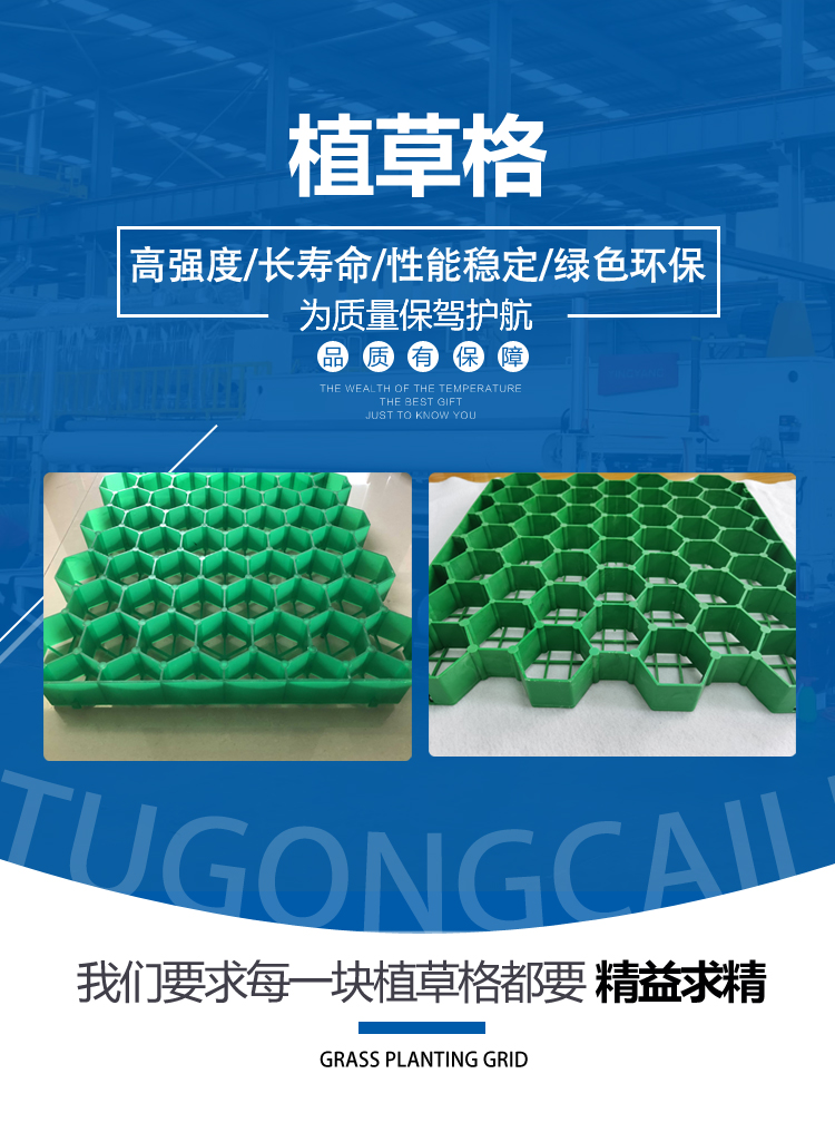 其次可以利于植草的成長;植草格的透水性、透氣性等長處,十分利于雨水的下滲,能夠推進(jìn)花卉、草皮根系以及葉花果莖的發(fā)育成長,不致于斷根而影響成長,友好的避免了人行踐踏。