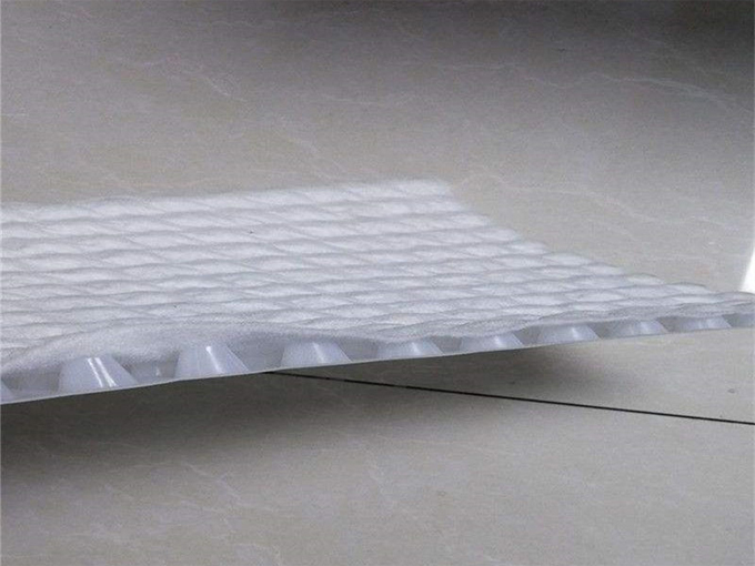虹吸排水板是由高密度聚乙烯純白原料,在熔融狀態(tài)下經(jīng)真空吸塑一次成型制成,制造出單向的連續(xù)密閉殼體凸起的板狀材料,形成一種膜、殼連接,具有獨立排水空間和一定支撐剛度的防護排水卷材。高分子防護排水異型片經(jīng)專用機型將長效雙抗土工布粘接在凸臺支點上,具有粘合度強、抗剝離度強度高的特點,是國際通用的排水材